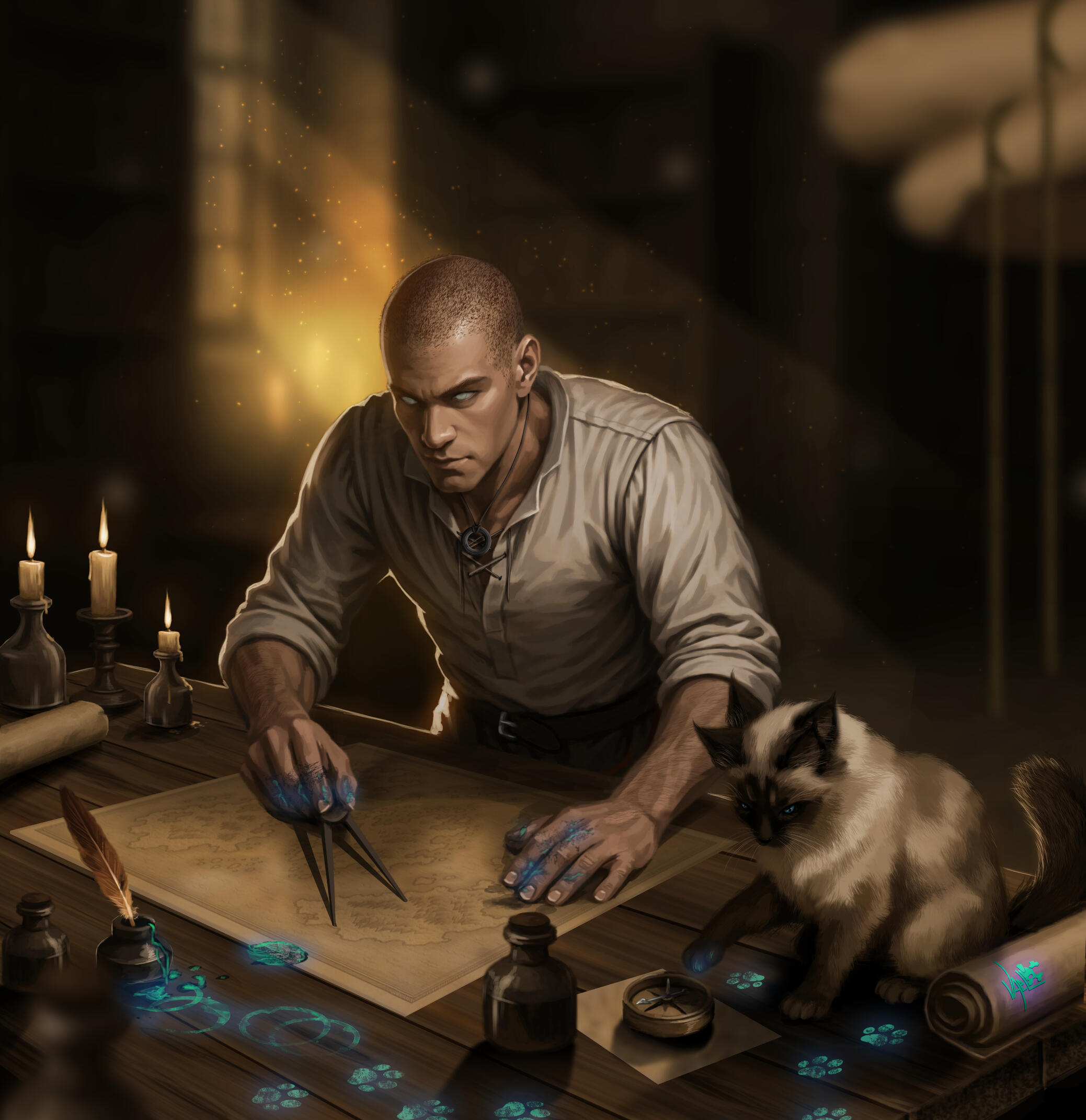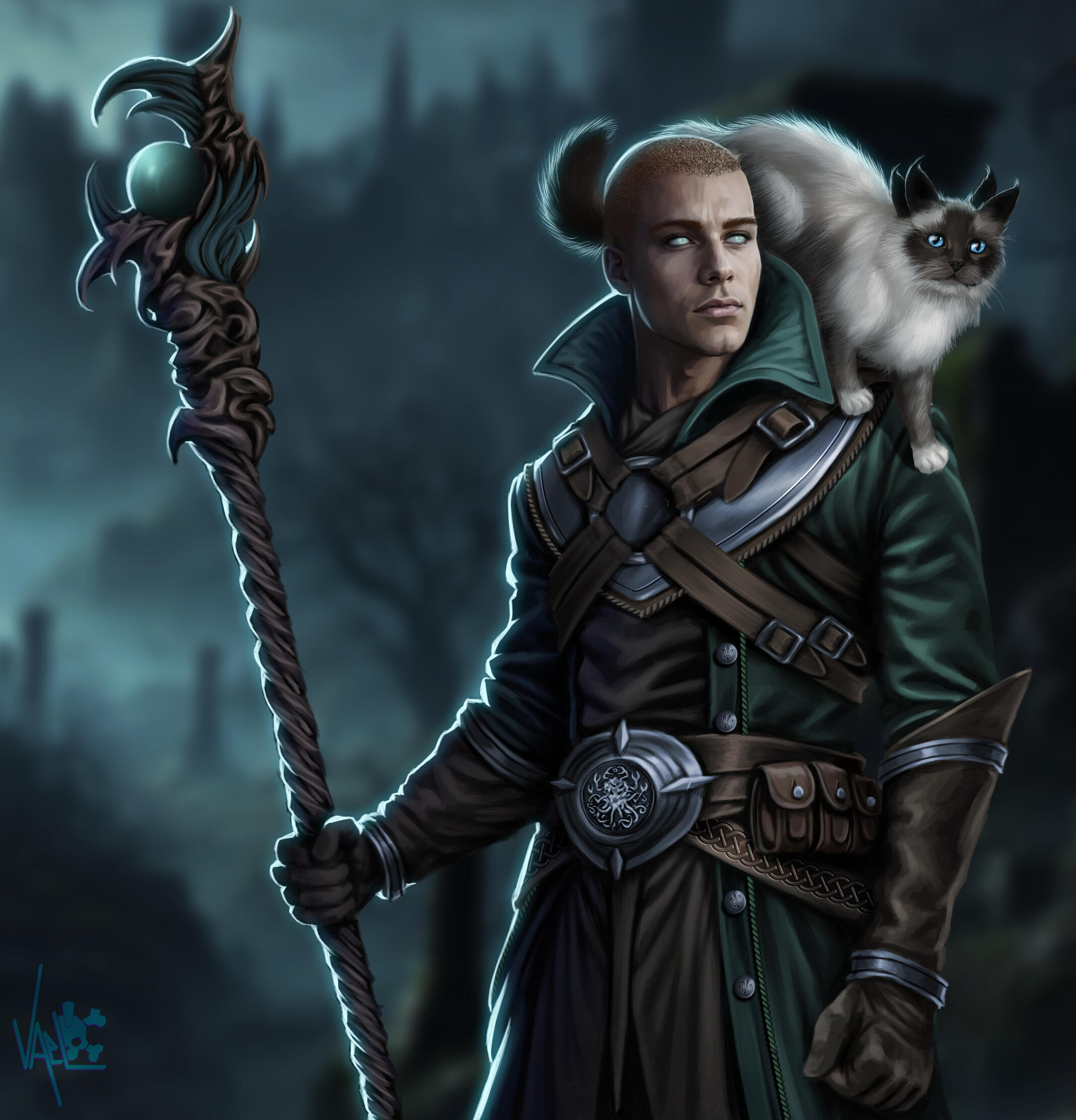 One of Ari's most striking feature is his eyes -- they're green, but just barely, the color mostly faded and clouded over, indicating that he's either entirely blind, or close to it. In spite of this, he moves with confidence and purpose, guided by an enchanted staff that's rarely out of his hands. The staff itself is intricate, a pale green orb centered at the head of it.With a need for control that might otherwise be out of his grasp, Ari is usually very meticulously groomed. His face is clean-shaven and his auburn hair is closely-cropped and never allowed to overgrow. His attire, always well-tailored to fit his medium-to-slim build, tends to favor dark greens and dark browns. He looks to be in his early twenties and he typically projects the image of a young man who has it all figured out, even if that isn't entirely true.Ari is seldom seen without his constant companion, a four-eared ragdoll cat named Atlas. More often than not, the blue-eyed grimalkin can be found draped across the Breton's shoulders in an almost regal fashion, as though life is simply something to be observed from a comfortable perch. The cat is unbothered by anything, content to watch the world pass by while Ari remains caught up in the constant performance of being exactly who he thinks he's supposed to be.
